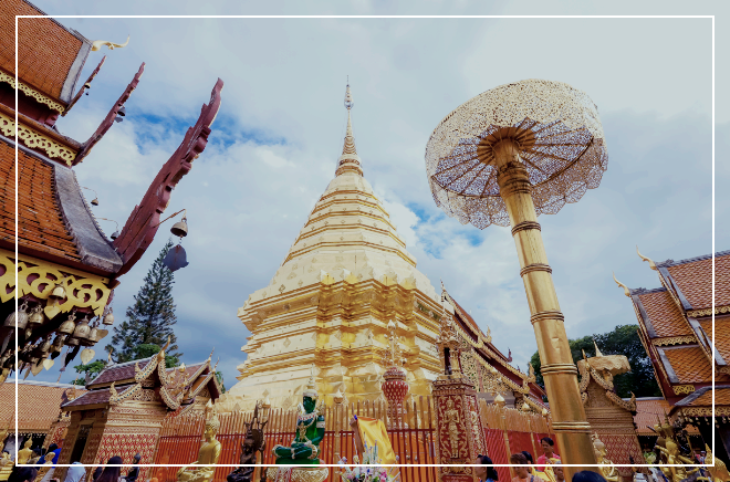 치앙마이의 대표적인 관광지인 도이 수텝 사원에서 치앙마이 시내를 내려다보며 아름다운 풍경을 감상할 수 있습니다 .